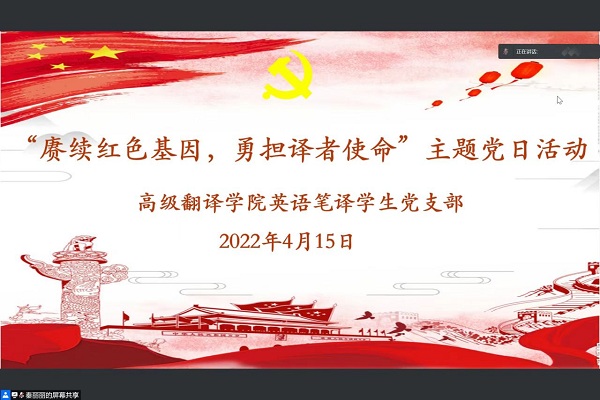 英语笔译学生党支部开展“赓续红色基因,勇担译者使命”线上主题党日活动。校党委书记殷奇出席本次活动,学院党委书记、副书记以及支部全体党员参加了活动。