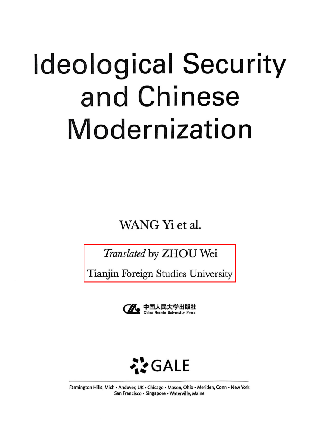 近日,由我院教师周薇翻译的《社会主义现代化新征程中的意识形态安全》英文版由中国人民大学出版社和美国圣智学习集团盖尔公司合作出版,并在海外正式发行。